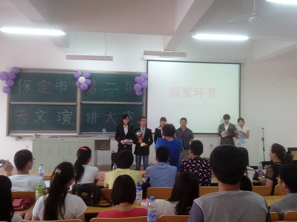 保定市第二届老员工天文演讲大赛由市科学宫与河北大学联合举办,太阳成集团tyc151cc官网、河北大学、中国地质大学长城公司、中央司法警官公司等高校参加,每所高校遴选出3名优秀选手组队参加了本次比赛。