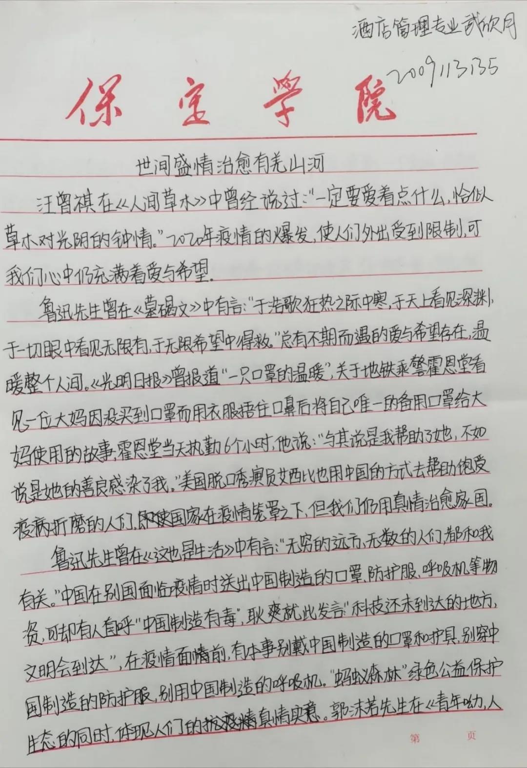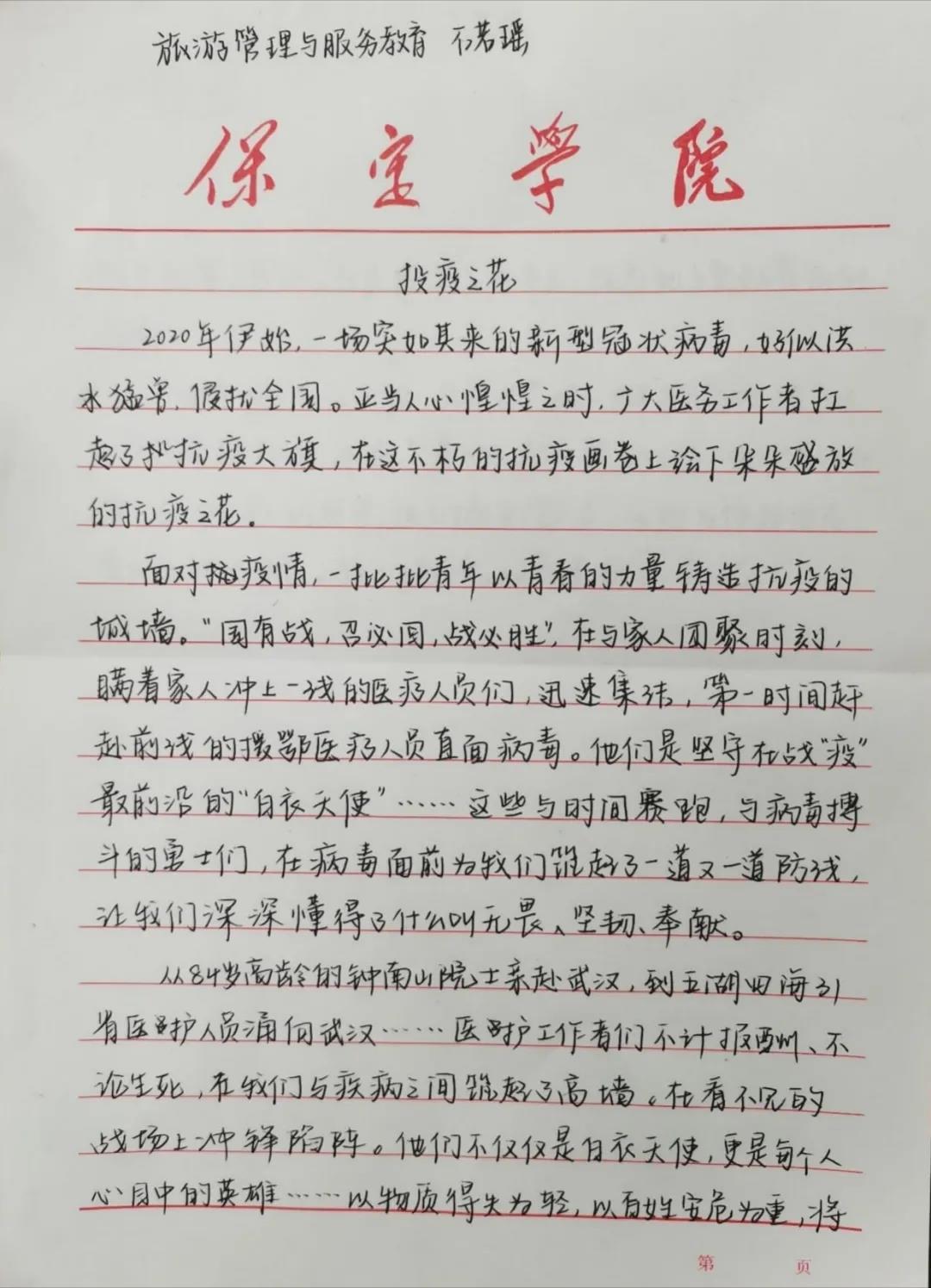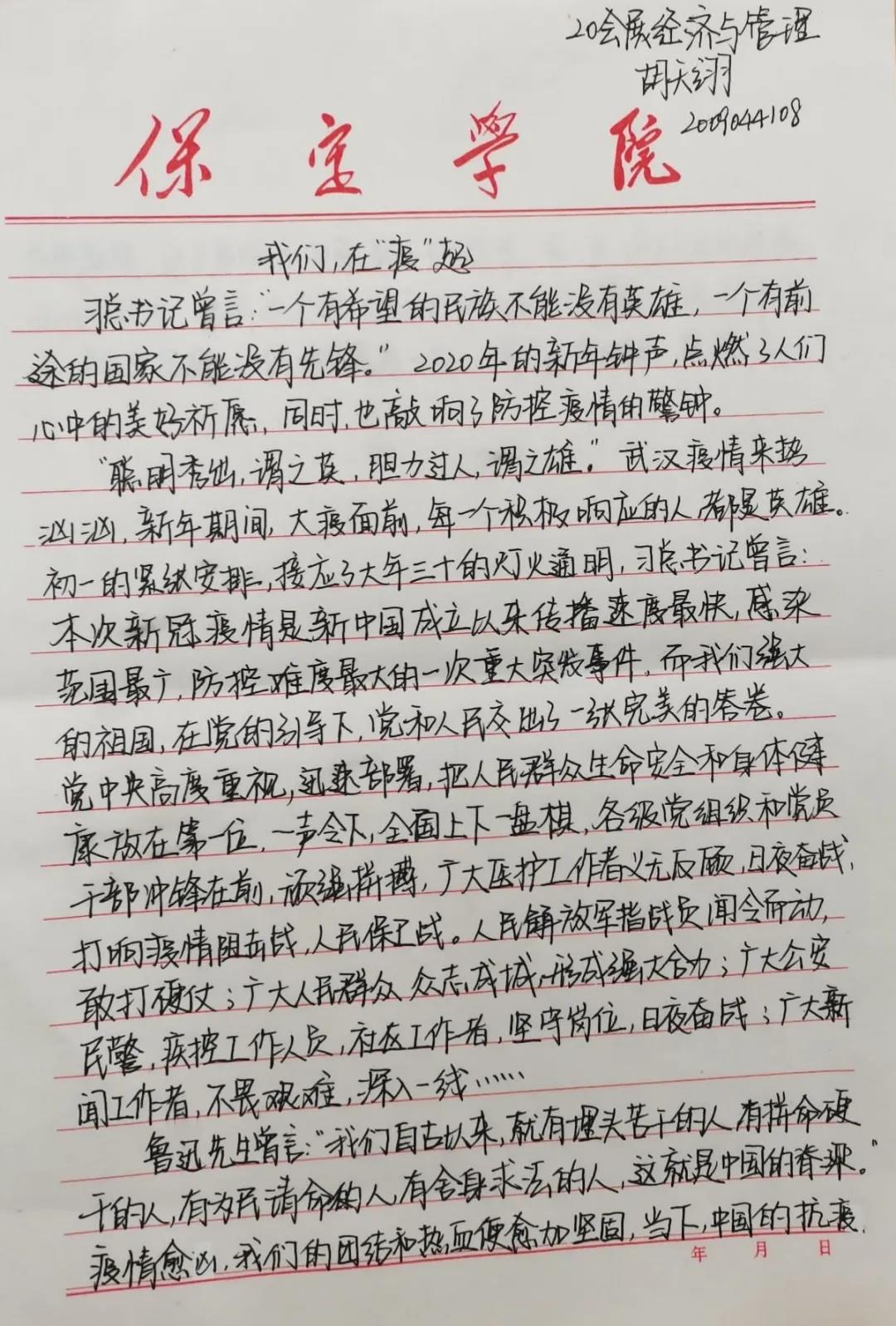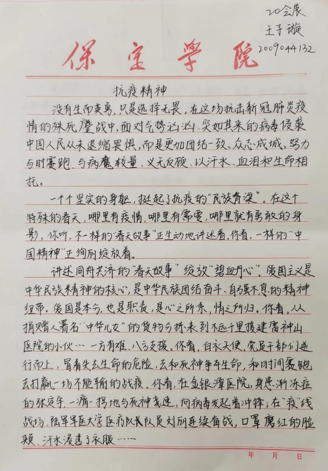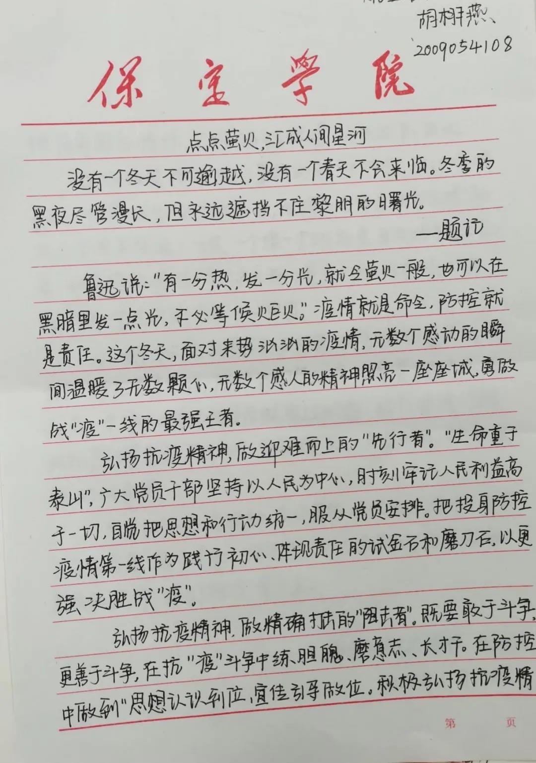 同学们用手中的笔,用一句句朴实的话语向战斗在一线的工作者、志愿者、参与者致敬,同时也展现了全国人民众志成城、万众一心投身抗疫的家国情怀,展现了疫情之中敢于担当、无私奉献的精神品质,展现了一方有难、八方支援的制度优势。
