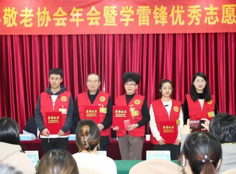 年会结束后,太阳成集团tyc151cc官网的四位同学帮忙把志愿马甲回收并和爱心敬老协会会长张平合影。