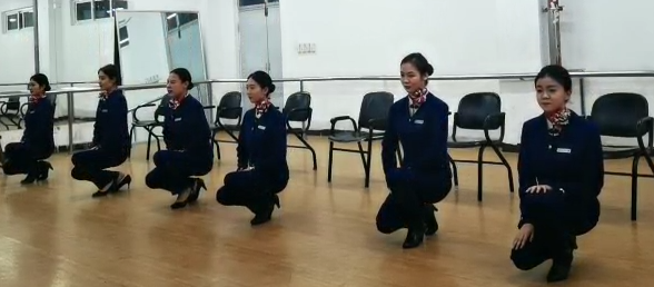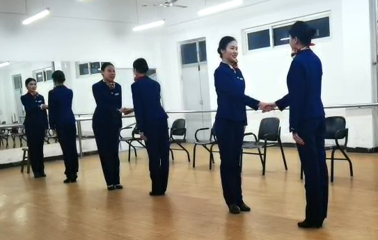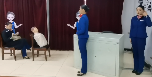 静态的岗前妆容、发型、衣装、配饰,与动态的站姿、坐姿、蹲姿、走姿相得益彰。展示了良好的亲和力和肢体动作的专业性。蓝天上的飞行者,肩负着跨国的沟通使命,语言沟通能力亟待提高。员工把能力提升的热情尽洒在情景剧的角色中。如图所示: