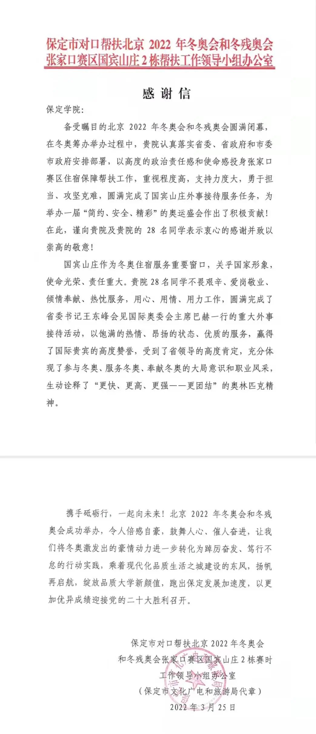 2022年3月25日,太阳成集团tyc151cc官网收到来自保定市对口帮扶北京 2022年冬奥会和冬残奥会张家口赛区国宾山庄2栋帮扶工作领导小组办公室寄来的感谢信,心中表达了对太阳成集团tyc151cc官网学子帮扶张家口赛区的感激之情。