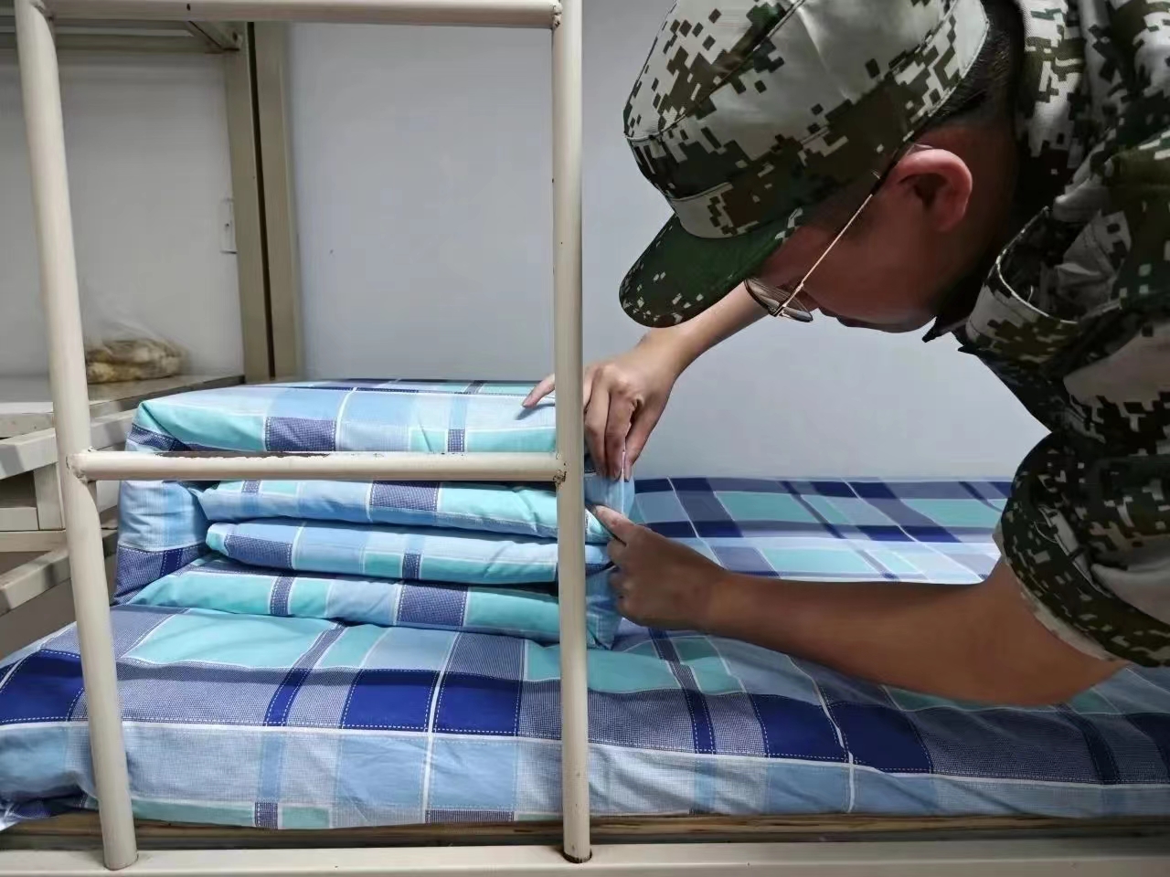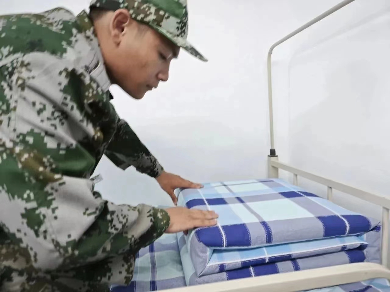 耐心细致地整修被子边角