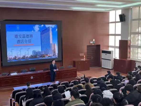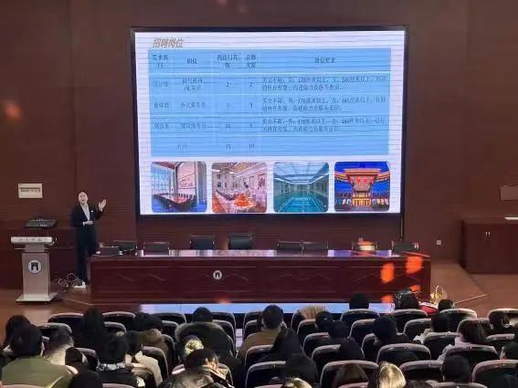 本次实习就业双选会诚邀北京民族饭店、北京友谊宾馆、北京好苑建国酒店、中国融通资产管理集团、雄安温德姆酒店、河北旅投国际酒店管理集团有限公司、保定希尔顿逸林酒店等多家单位参会。各企业围绕行业现状、企业基本情况与发展历程、企业文化、福利待遇、岗位需求、职业发展和实习生管理等方面做了详尽的介绍,在场员工认真聆听各企业宣讲内容,明确自己的实习意向。