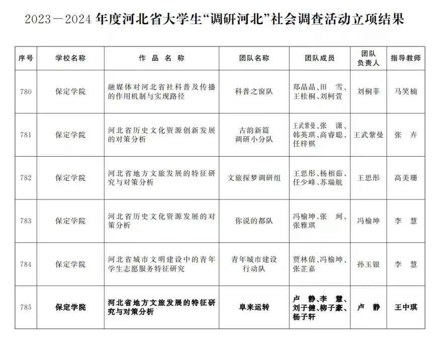 为全面学习贯彻党的二十大精神,深入学习贯彻习近平总书记视察河北重要讲话精神,引导青年员工在奉献社会中锤炼思想,共青团河北省委、河北省社科院、河北省员工联合会共同组织开展了2023-2024年度河北省老员工 “调研河北”社会调查活动。活动开展以来得到了广大师生的积极响应,河北省101所高校参与该项目申报。通过各高校择优推选,再经省级有关专家审查评定,由公司王中琪老师指导,卢静同学负责的《河北省地方文旅发展的特征研究与对策分析》项目准予立项。