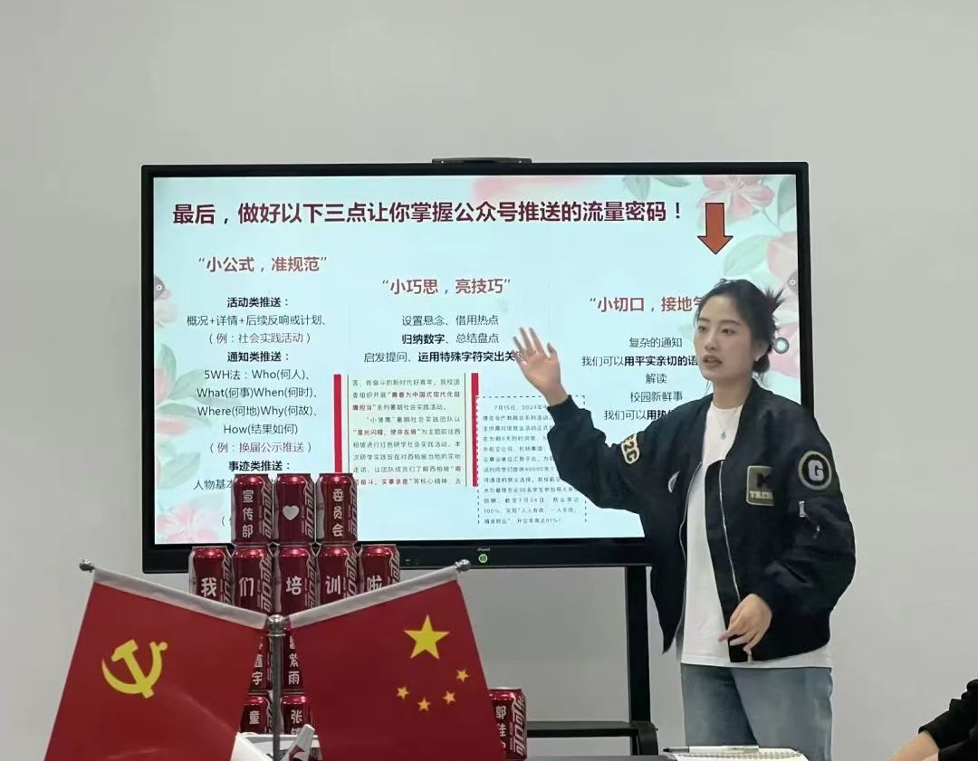 本次培训以经验分享、案例分析以及实践操作的形式展开,特邀请到有两年宣传工作经验丰富的曹紫雨学姐进行分享。曹紫雨学姐通过分享其在宣传部的工作经历,从写作技巧、图片处理、运营维护三方面展开。在图片处理方面,通过案例分析和实践操作的方式,引导部员干事们思考如何拍摄突出重点与主题,激发他们的创新思维和表达能力,激发大家对宣传工作的热情与期待。