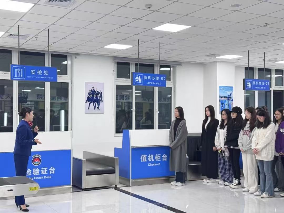 跟随着讲解员的脚步,新生们开启了这场充满知识与梦想的探索之旅。在参观过程中,讲解员们带领每位同学参观了实训中心问询处、值机办理处、安检处以及登机处等一整条完整的地服生态链,沉浸式体验了航空模拟舱,一同感受了客舱内的真实环境。通过实地参观和亲身体验,新生们不仅了解到登机的全部流程,更加体会到航空专业的独特魅力。