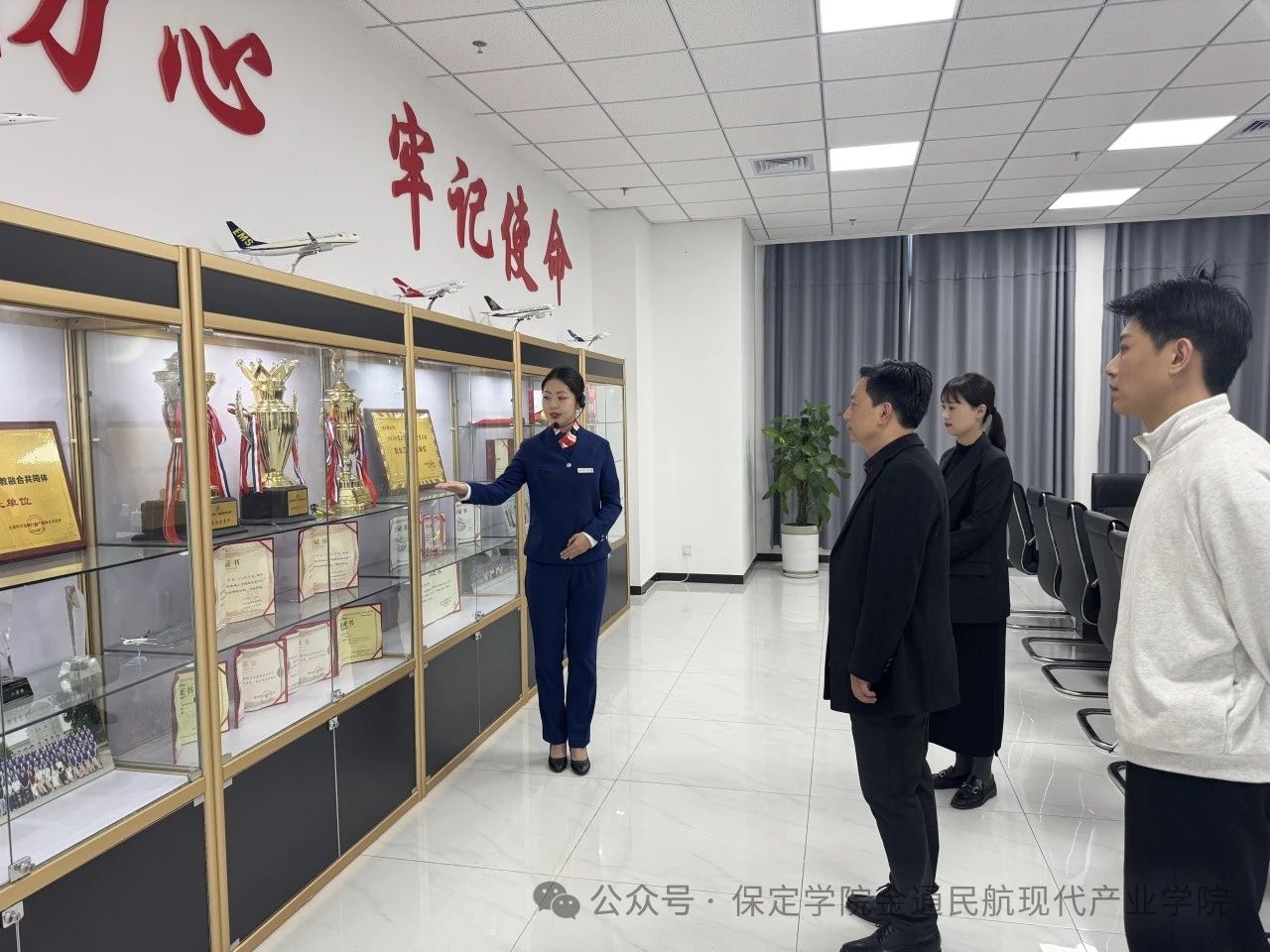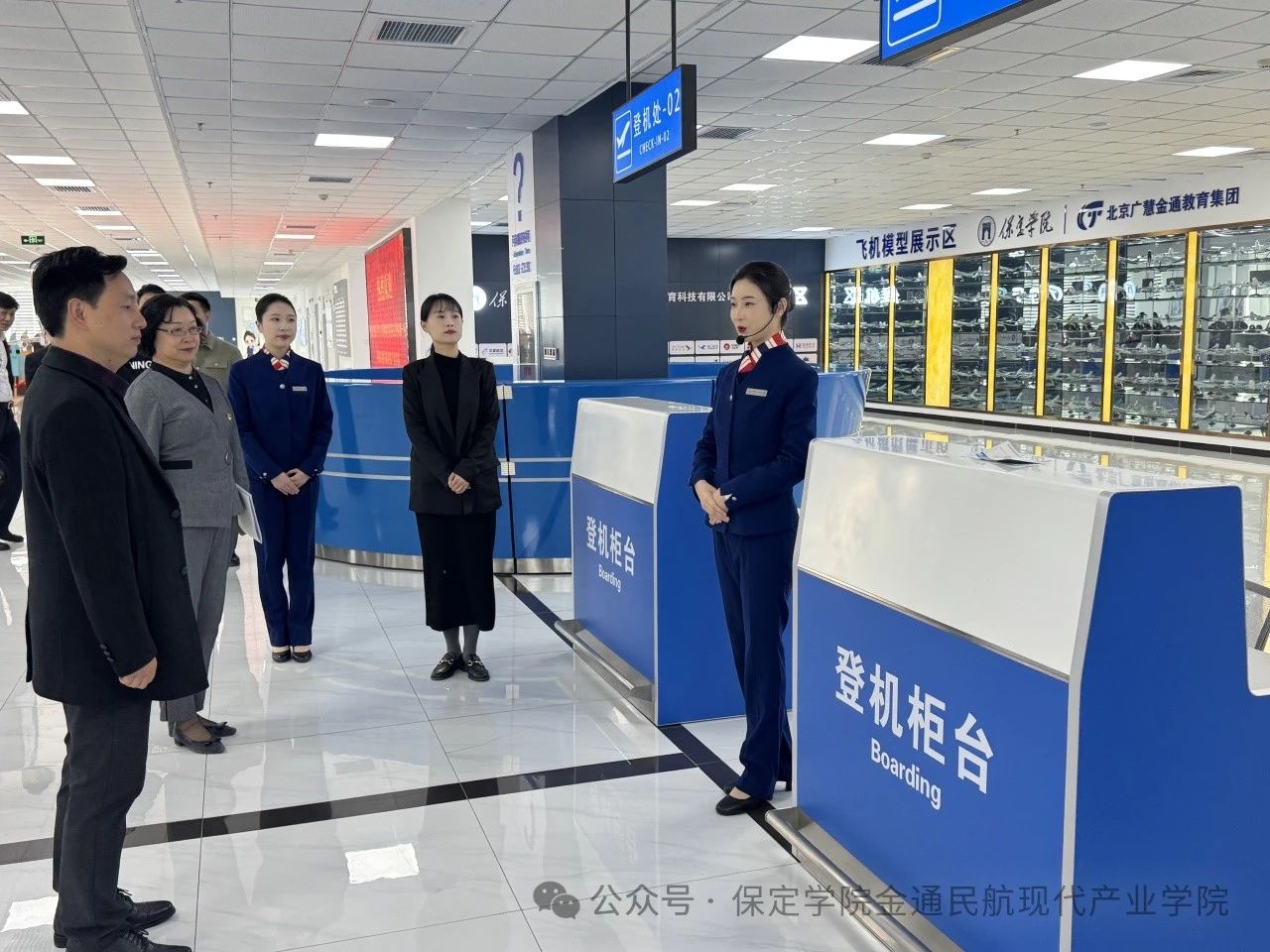 湖北民族大学领导及教师团队一行赴太阳成集团tyc151cc官网航空实训中心进行实地参观。在参观过程中,讲解员们带领各位老师参观了实训中心问询处、值机办理处、安检处以及登机处等一整条完整的地服生态链,对航空专业“全真环境育人”理念给予高度评价。参观过程中,双方领导及教师就实训课程设计、设备操作规范等细节展开交流研讨。