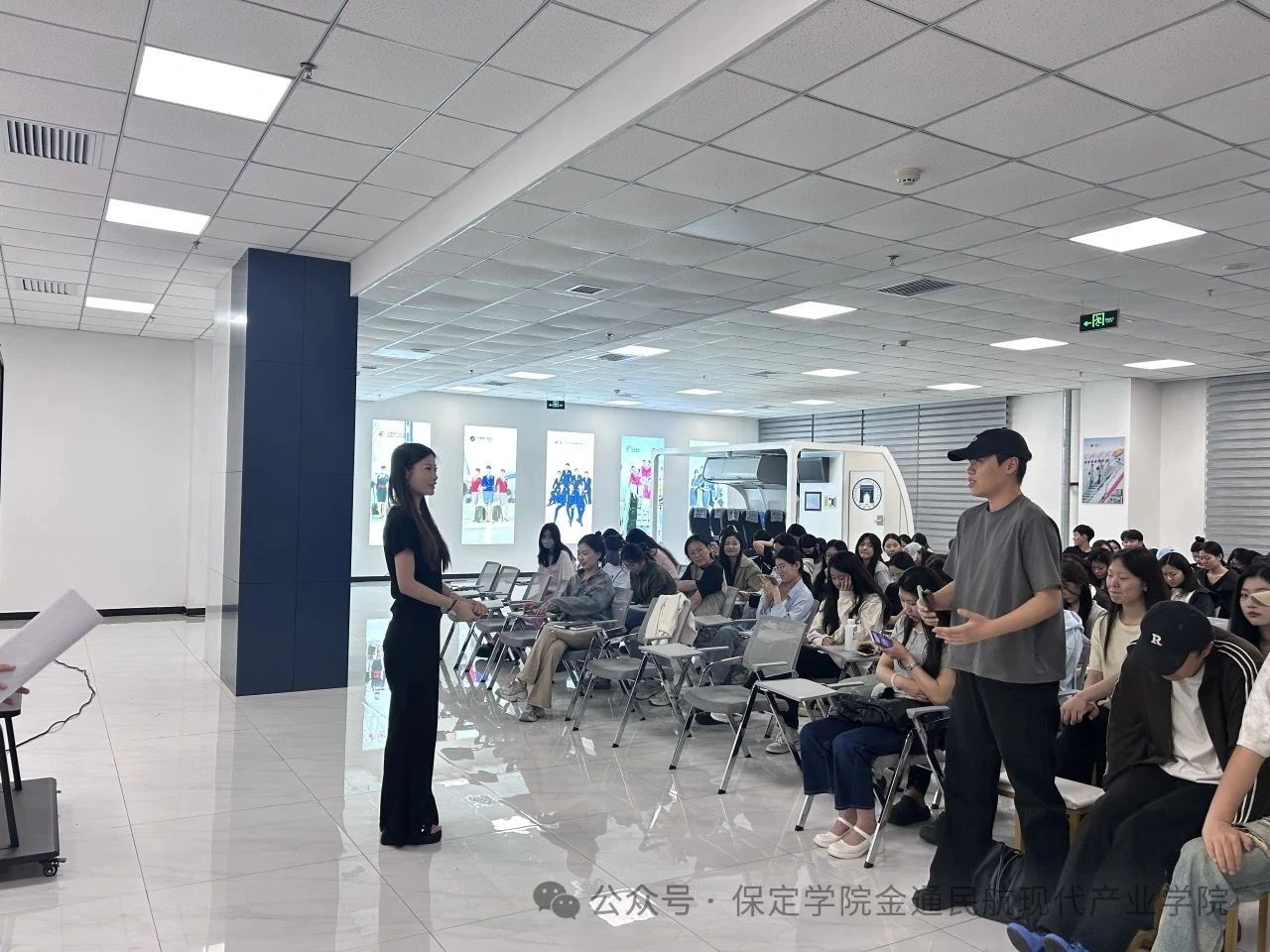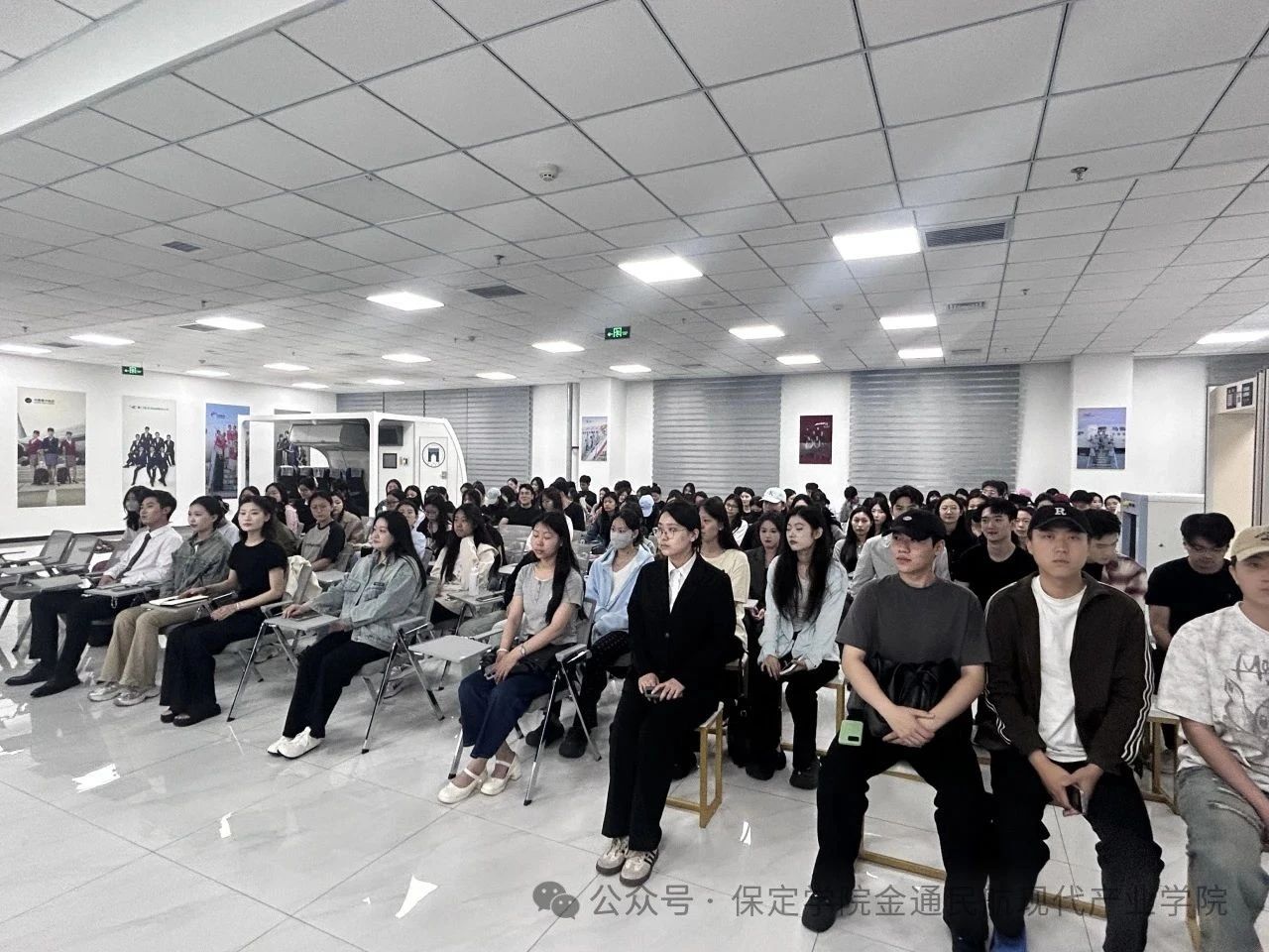 首期活动于2025年5月22日晚7时,在航空实训中心模拟舱前拉开帷幕。聚焦大赛备赛与航司面试技巧,本期赛前交流会特别打造"在飞员工+在校学姐"双线经验分享模式,邀请了优秀在飞员工2020级空中乘务专业温蕊萁(现就职于中国南方航空)以及2022级优秀参赛者郝旭蝶、王鑫,吸引了130余名航空学子齐聚现场,共同学习学姐们的实战经验,为逐梦蓝天蓄力充电!