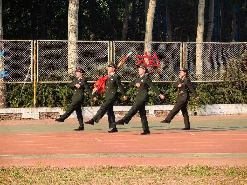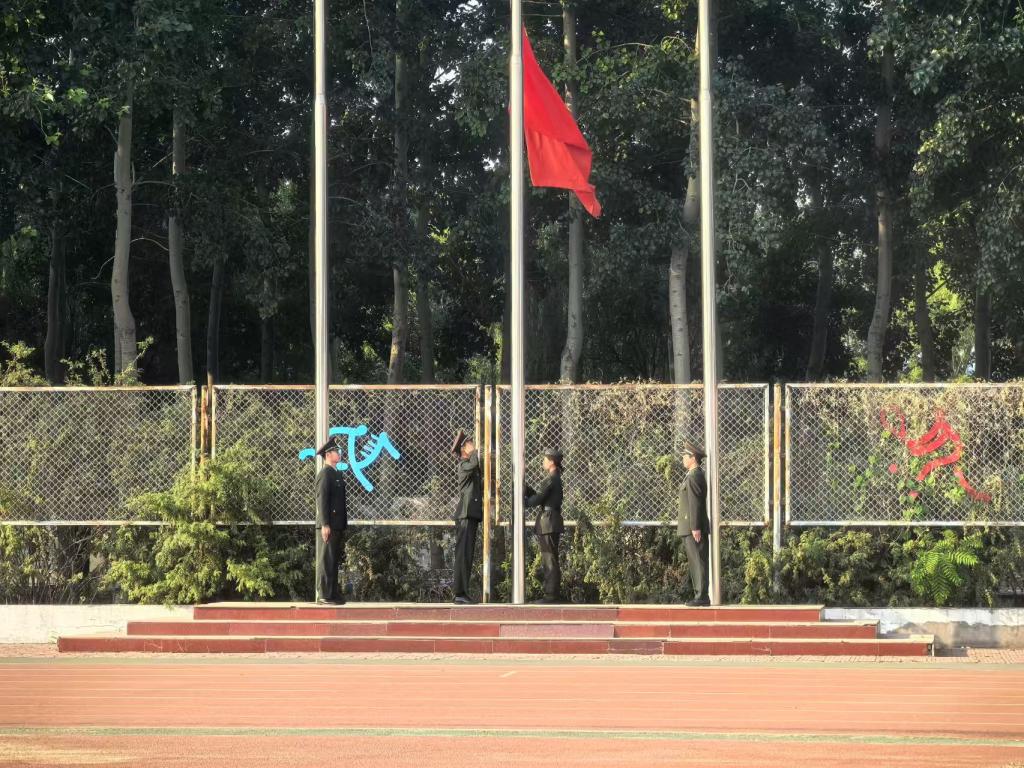 迎着朝阳,踏着晨曦,国旗护卫队迈着整齐划一的步伐走向升旗台,他们身姿挺拔,眼神坚毅。随着国歌奏响,五星红旗在晨光中冉冉升起,全体师生庄严肃立,行注目礼,心中激荡着对祖国的无限热爱与崇高敬意。