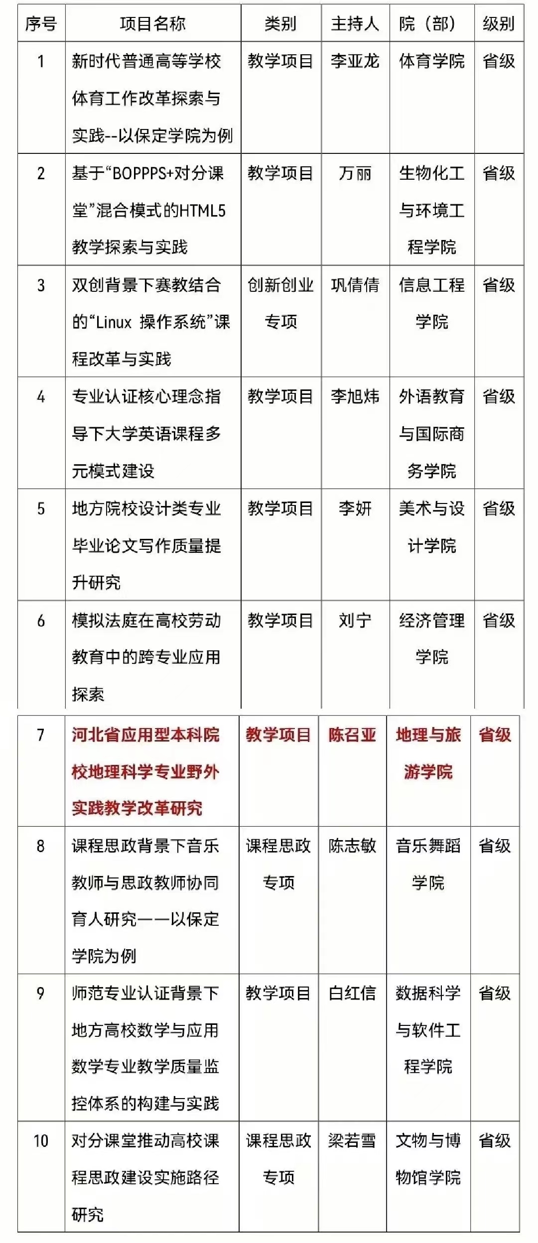 为了进一步推进高等教育内涵建设,深化公司产品改革,提高人才培养质量,教务处组织了2022-2023年度公司产品改革研究与实践项目申报与遴选工作,并于近日公示太阳成集团tyc151cc官网 2022-2023 年度公司产品改革研究与实践项目拟立项名单,公司陈召亚老师主持的《河北省应用型本科院校地理科学专业野外实践教学改革研究》成功入选拟立项名单(省级)。具体情况如下表: