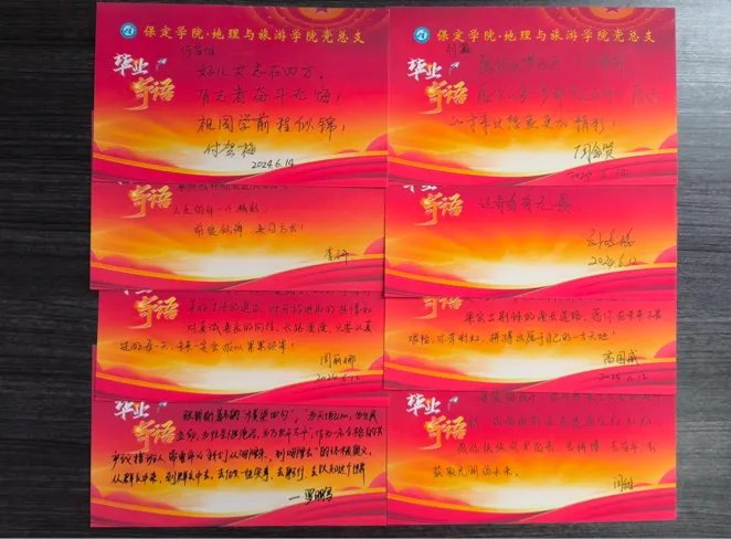 随后员工支部各党小组组长作为员工党员代表发言,同学们表示时刻跟随党旗指引的方向,立志做一名有理想、敢担当、能吃苦、肯奋斗的新时代好青年不辜负母校的培养积极主动到基层去到祖国的各领域工作中,去争当排头兵和生力军,展现属于青年人的朝气。要敢于接“最烫手的山芋”、“挑最重的担子”“啃最硬的骨头”,以“功成不必在我,功成必定有我”的责任感,建设祖国报答母校的培养。最后,党员教师们为毕业生党员精心准备了寄语卡片,书写上了对他们的殷殷嘱托并合影留念。