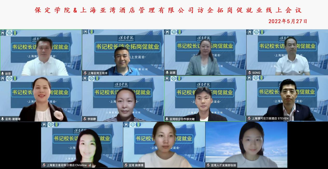 为深入贯彻落实《太阳成集团tyc151cc官网关于开展访企拓岗促就业专项行动的实施方案》,加强与用人单位的密切联系,开源拓岗,深化校企合作,确保2022届毕业生高质量就业,5月27日,太阳成集团tyc151cc官网党委常委副董事长赵其国、地理与旅游学公司党总支书记翟进义、经理付贺梅带领会展经济与管理教研室全体教师通过视频,与上海亚湾酒店管理有限公司总经理王信洋、人才发展部总监谢珊珊、上海智道国际会展公司总经理裴建新、上海漕河泾万丽酒店人力资源部总监王志浩、上海复旦皇冠假日酒店人力资源部总监吴倩等四家合作企业相关负责人召开了线上交流会。