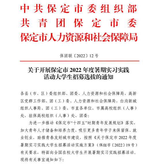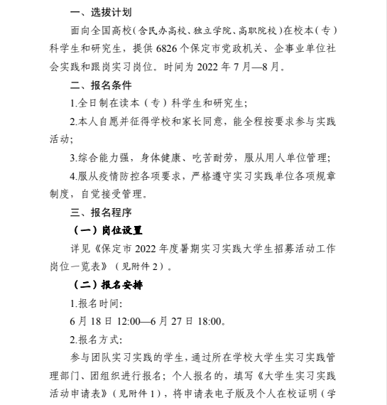 保定市开展的2022年度暑期实习实践活动老员工招募选拔已经开始报名。本次活动主要面向全国高校(含民办高校、独立公司、高职院校)在校本(专)科员工和研究生,共计提供6826个保定市党政机关、企事业单位社会实践和跟岗实习岗位,需要注意,报名时间为6月18日12:00—6月27日18:00。