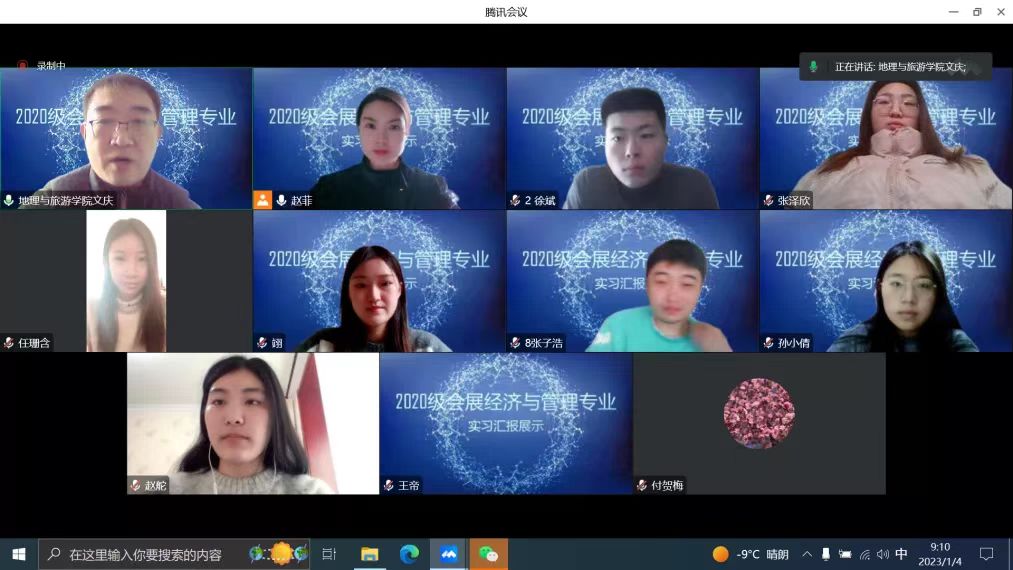 2023年1月4日,会展经济与管理教研室通过腾讯会议平台举行了2020级会展经济与管理专业实习总结汇报会,汇报会根据员工们的实习所在地北京、上海分为两组进行,会展经济与管理专业李丽静老师、刘晓宁老师、文庆老师、赵菲老师、石征老师在线听取了员工们的总结汇报。