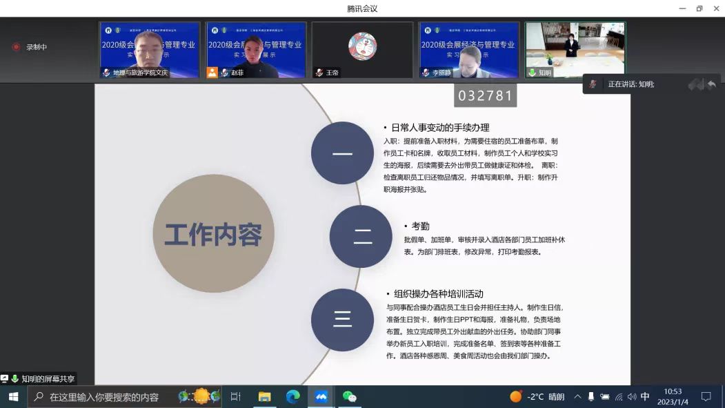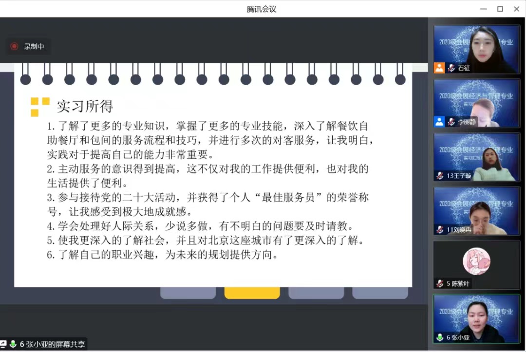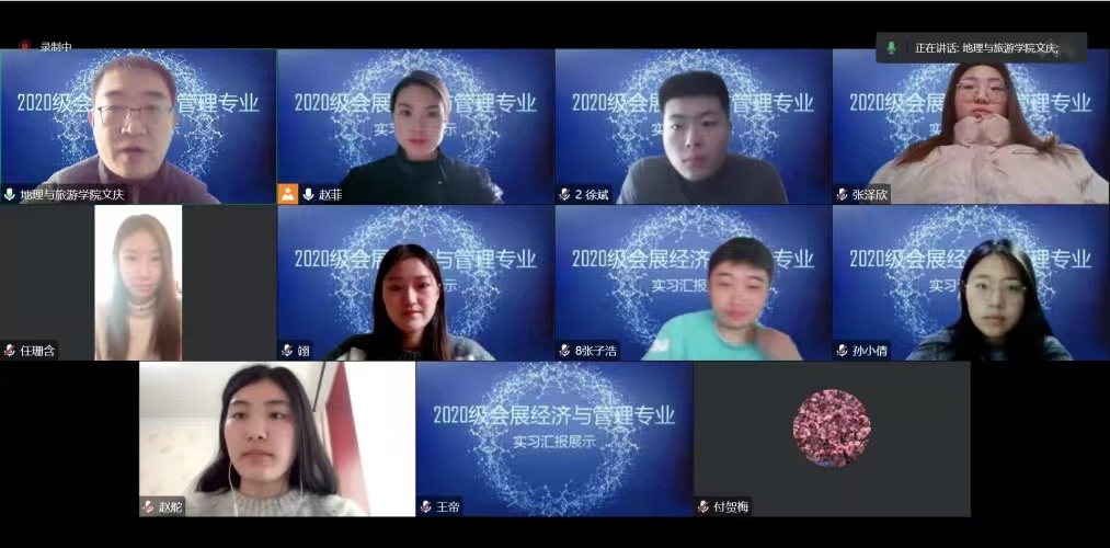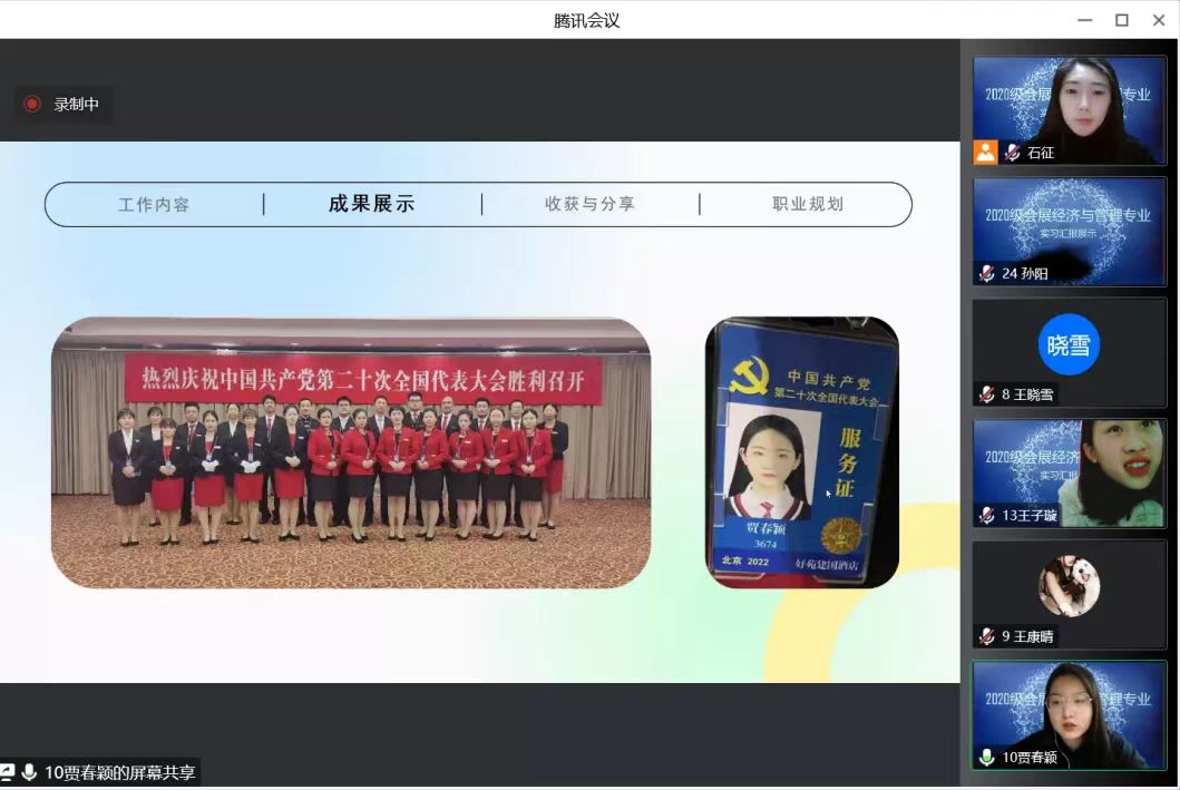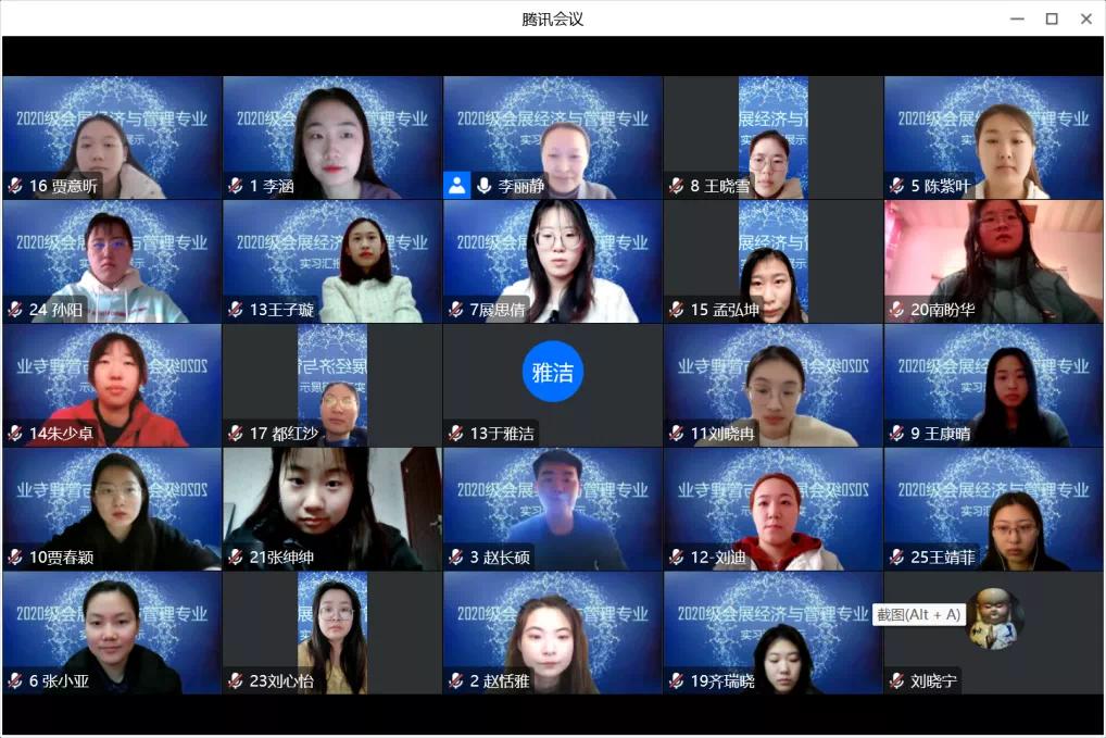 2023年1月4日,会展经济与管理教研室通过腾讯会议平台举行了2020级会展经济与管理专业实习总结汇报会,汇报会根据员工们的实习所在地北京、上海分为两组进行,会展经济与管理专业李丽静老师、刘晓宁老师、文庆老师、赵菲老师、石征老师在线听取了员工们的总结汇报。