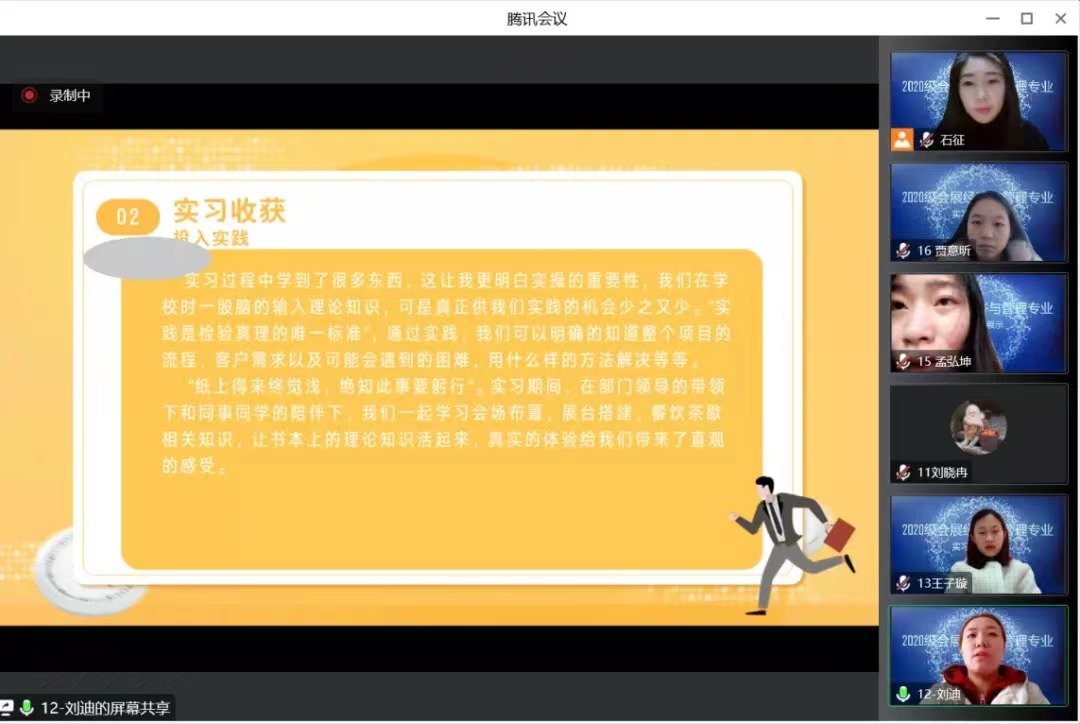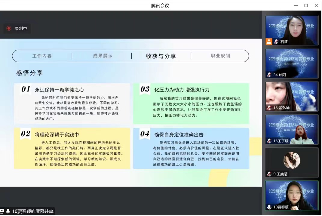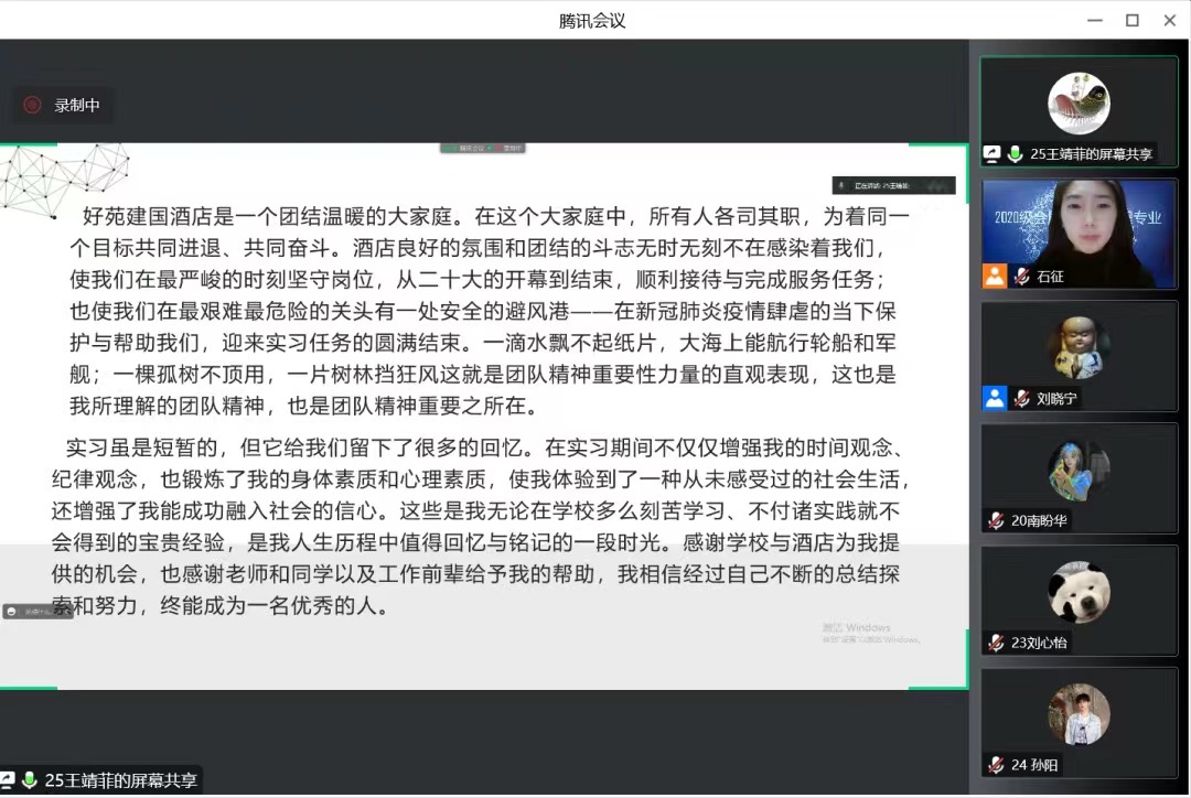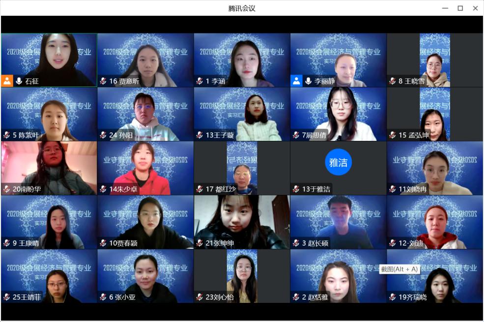 2023年1月4日,会展经济与管理教研室通过腾讯会议平台举行了2020级会展经济与管理专业实习总结汇报会,汇报会根据员工们的实习所在地北京、上海分为两组进行,会展经济与管理专业李丽静老师、刘晓宁老师、文庆老师、赵菲老师、石征老师在线听取了员工们的总结汇报。