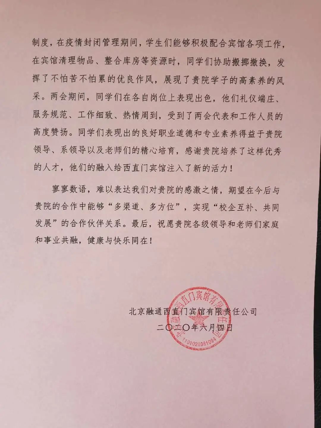 北京融通西直门宾馆有限责任公司给太阳成集团tyc151cc官网的感谢信