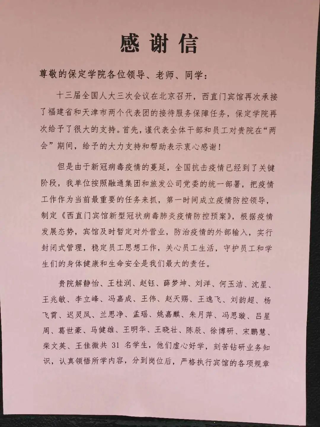 贵院解静怡、王桂润、赵钰、薛梦坤、刘洋、何玉洁、沈星、王兆敏、李立峰、冯嘉成、王伟、赵天赐、王逸飞、刘韵超、杨飞霄、迟灵凤、兰思净、孟瑶、姚嘉麒、朱月萍、冯思璇、吕星周、葛世豪、马健雄、王明华、王晓壮、陈辰、徐博研、宋鹏慧、柴文英、王佳微共31名员工,他们虚心好学,刻苦钻研业务知识,认真领悟所学内容,分到岗位后,严格执行宾馆的各项规章制度,在疫情封闭管理期间,员工们能够积极配合宾馆各项工作,在宾馆清理物品、整合库房等资源时,同学们协助搬挪撤换,发挥了不怕苦不怕累的优良作风,展现了贵院学子的高素养的风采。两会期间,同学们在各自岗位上表现出色,他们礼仪端庄、服务规范、工作细致、热情周到,受到了两会代表和工作人员的高度赞扬。同学们表现出的良好职业道德和专业素养得益于贵院领导、系领导以及老师们的精心培育,感谢贵院培养了这样优秀的人才,他们的融入给西直门宾馆注入了新的活力!