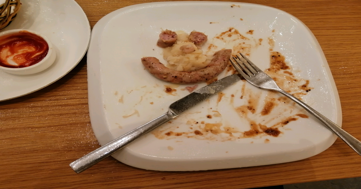 客人用吃剩下的香肠和土豆泥摆出的笑脸