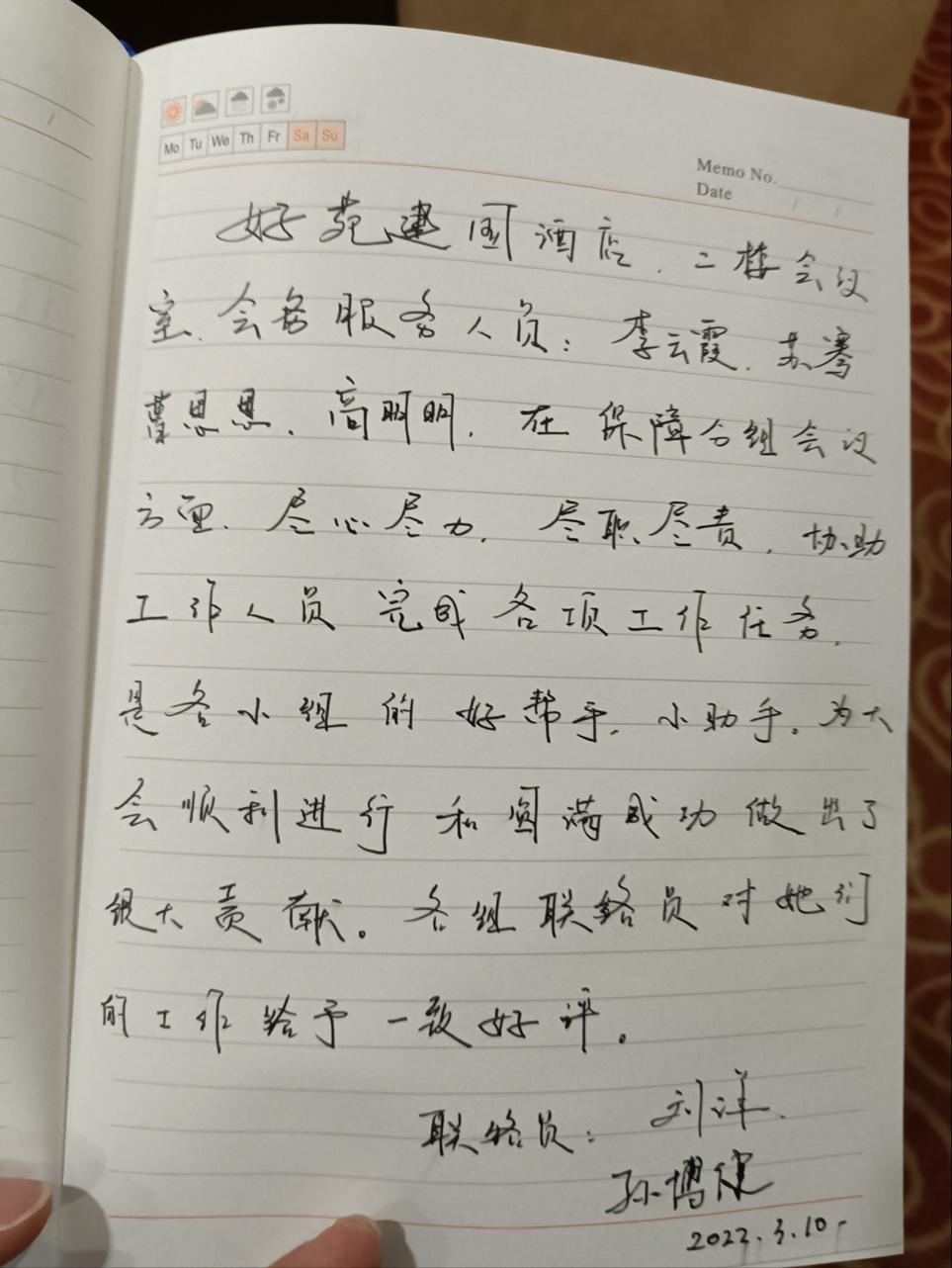 接待了北京政协和人民代表大会,见到各个领域的优秀代表,虽然志愿服务是较辛苦的,但我们要在岗位上快速调整状态,将奉献、友爱、互助、进步”的志愿者精神融入到志愿服务当中。用奉献作诗,让青春作证!用自己的青春激情助力全运,谱写青年志愿者的活力新篇章。最开心的是在两会得到喜欢的代表的签名。