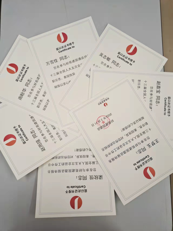两会志愿服务圆满结束后,酒店组织我们拍了合照,发了锦旗和荣誉证书,每次看到这些光荣感油然而生。