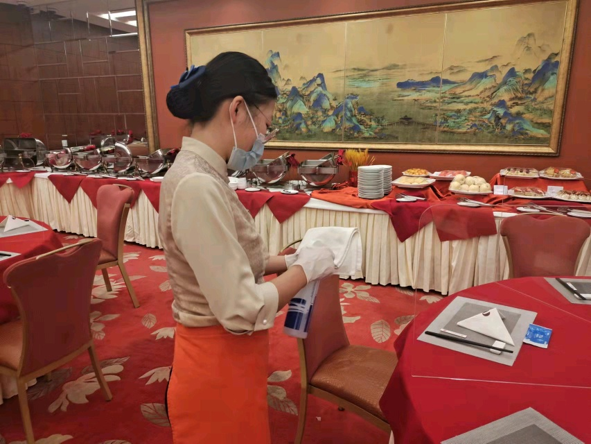 在两会期间,我们接待的是辽宁代表团,我们的主要工作是服务他们的三餐准备工作并且在吃饭的时候给他们收盘子,和三餐结束后的消毒工作。