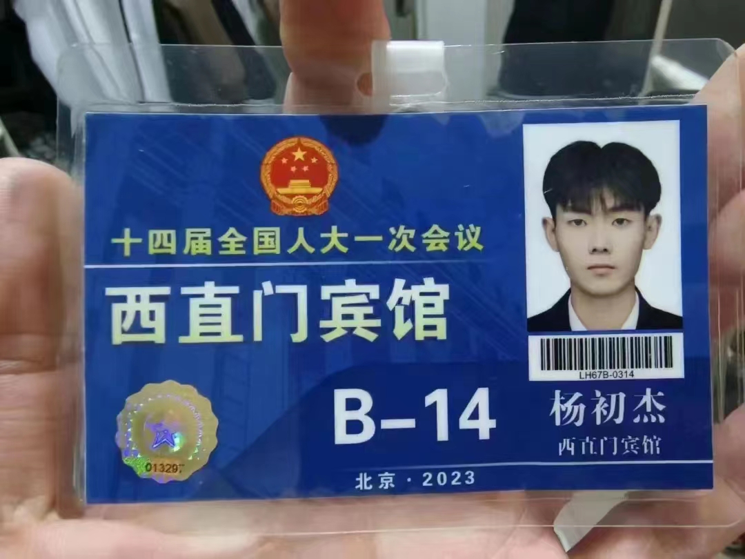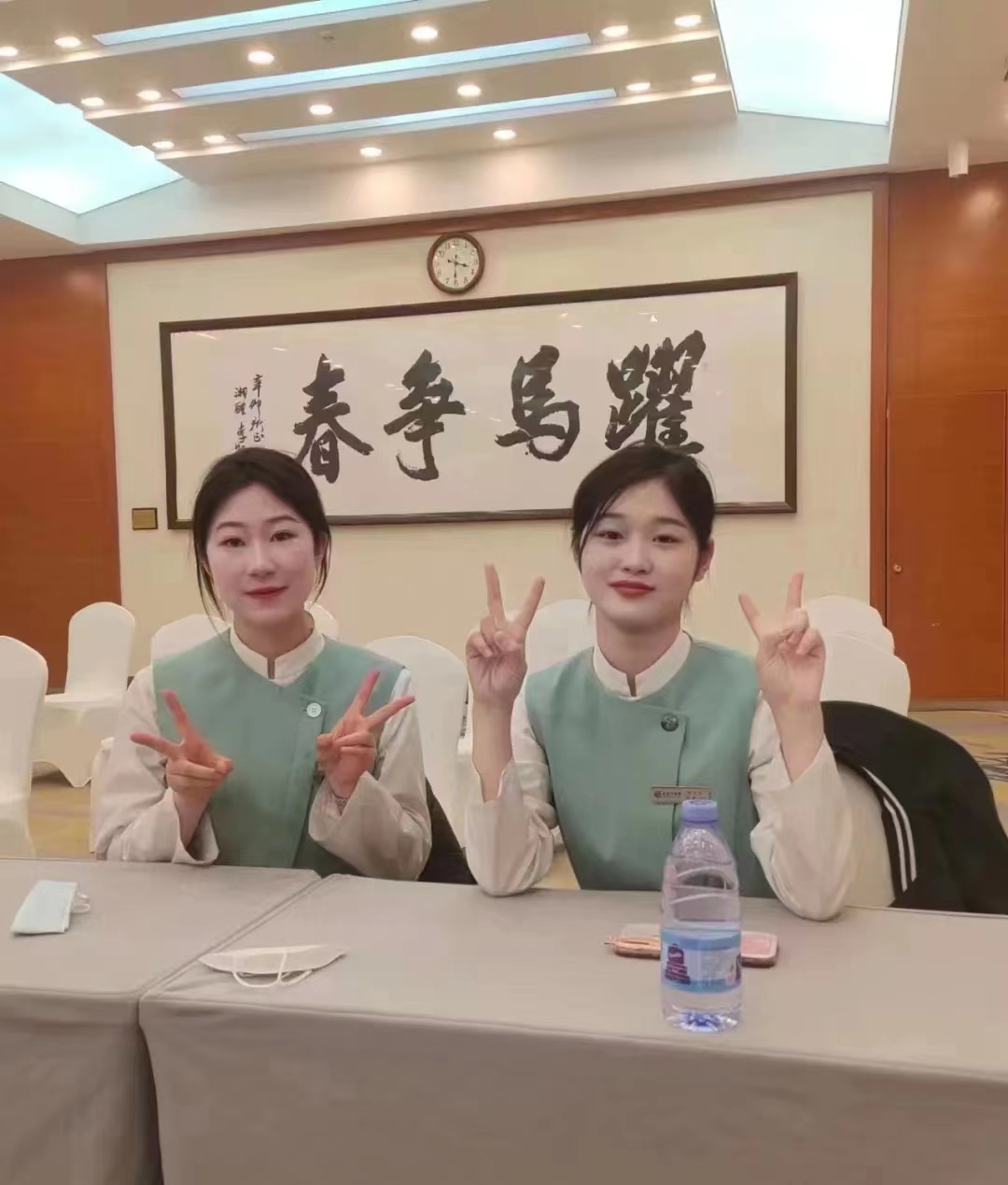 我分在了客房部,客房部是非常重要的一个部门,其主要任务是给两会期间开会的代表提供一个舒适,安静,优雅的住宿环境,我们仔细地观察每位代表的生活习惯,给他们提供完美的服务。最厉害的环节就是个性化服务:写一些暖心便利贴,做手工和床饰。在这一个月的工作中,虽然辛苦但又很充实。我接待的是天津团,每天很早起床,化着精致的妆容,整洁的工服,标准的站姿和微笑,来迎接代表,这些代表平时只有在电视上能看到,这次却可以离得很近,第一次见代表非常紧张,代表气场强大,但接触下来代表很亲切,平易近人。我收获了深厚的友谊,还有阿姨们的照顾,感到温暖。未来,我踔厉奋发,勇往直前。