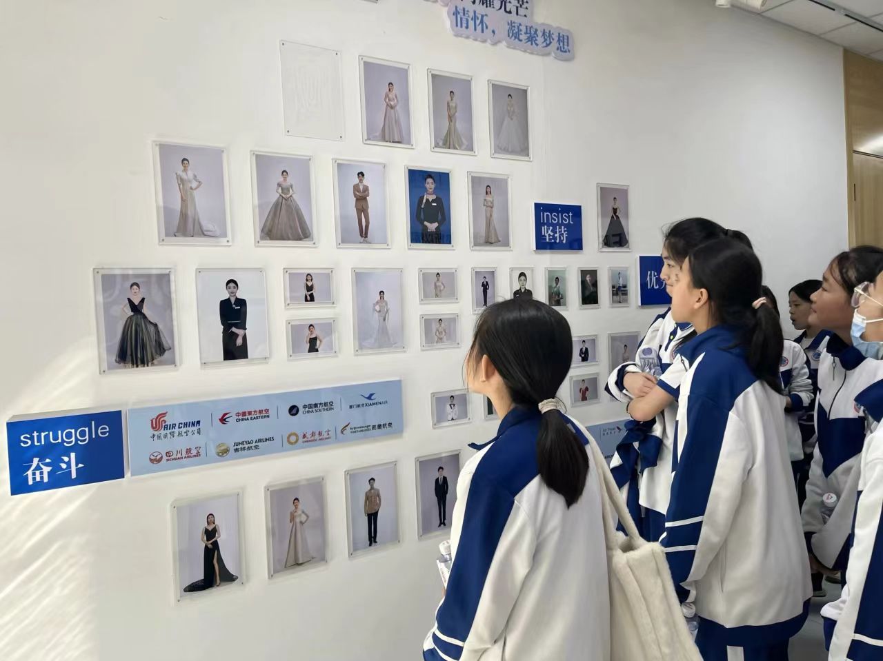 在结束一楼的参观后同学们迈着整齐的步伐通过明亮的楼梯便到达了二楼,走廊里文化墙上丰富的内容使得他们纷纷驻足围观,健身房、形体室、实训室、化妆室、会议室以及CBT实训室等各个功能设施完备的教室给他们留下了深刻的印象。