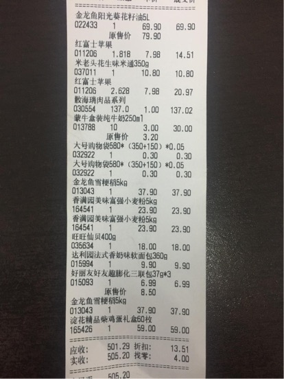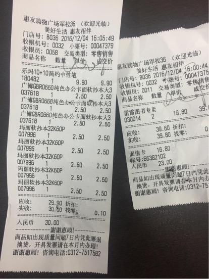 资源与环境系青年志愿者分会于2016年12月5日前往保定市东小庄村看望因意外伤害致残辍学的张宏伟家中,此活动所使用善款为上次白沟剩余善款604.8元。以下是物品清单及费用票据: